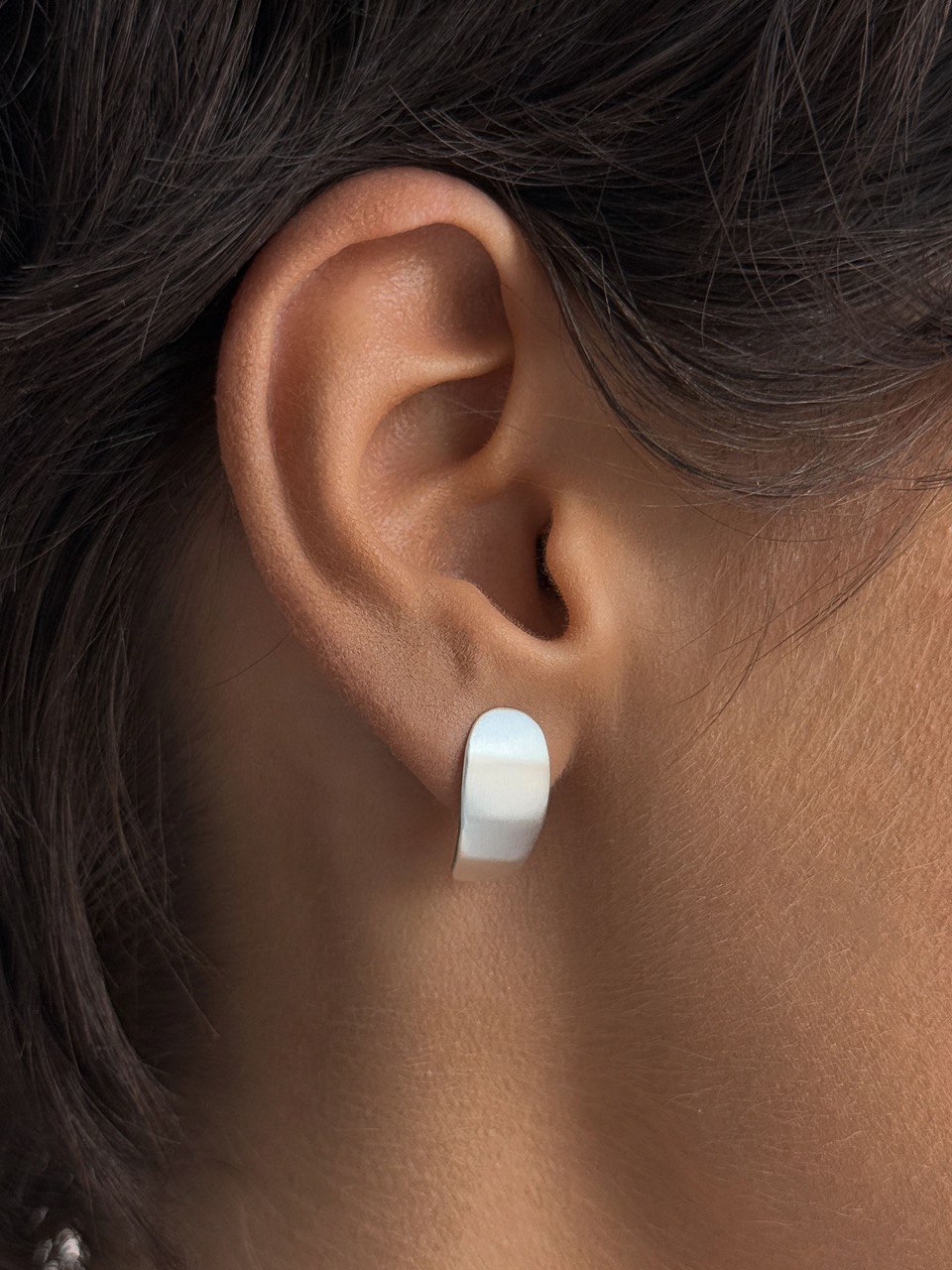 Изогнутая форма с лёгким наклоном повторяет линию мочки, а матовая поверхность подчёркивает объём и пластичность серебра