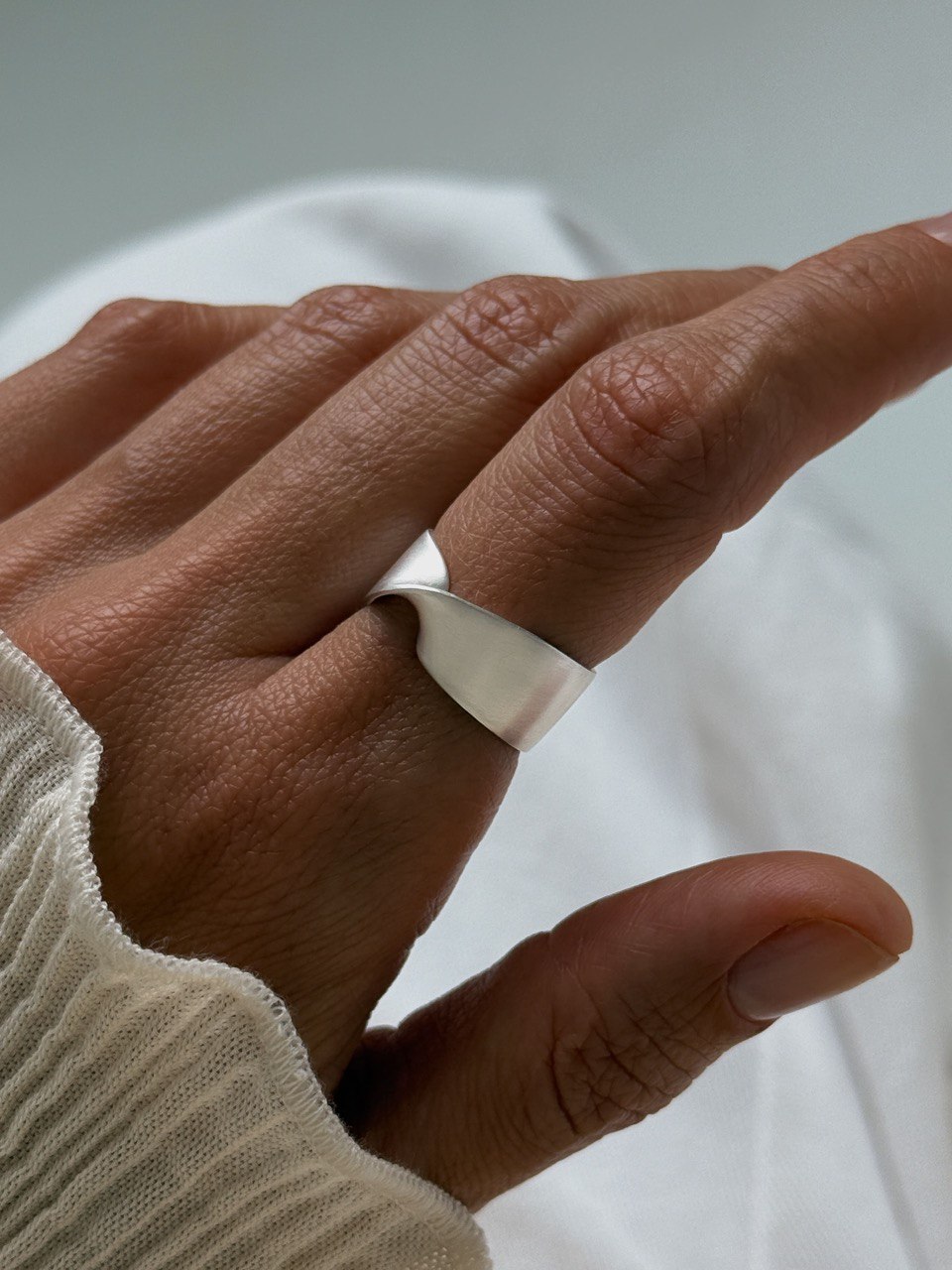 Плавный изгиб перекрученного металла создает мягкую асимметрию. Поверхность специально не отшлифована, с фактурой и мягким матовым блеском