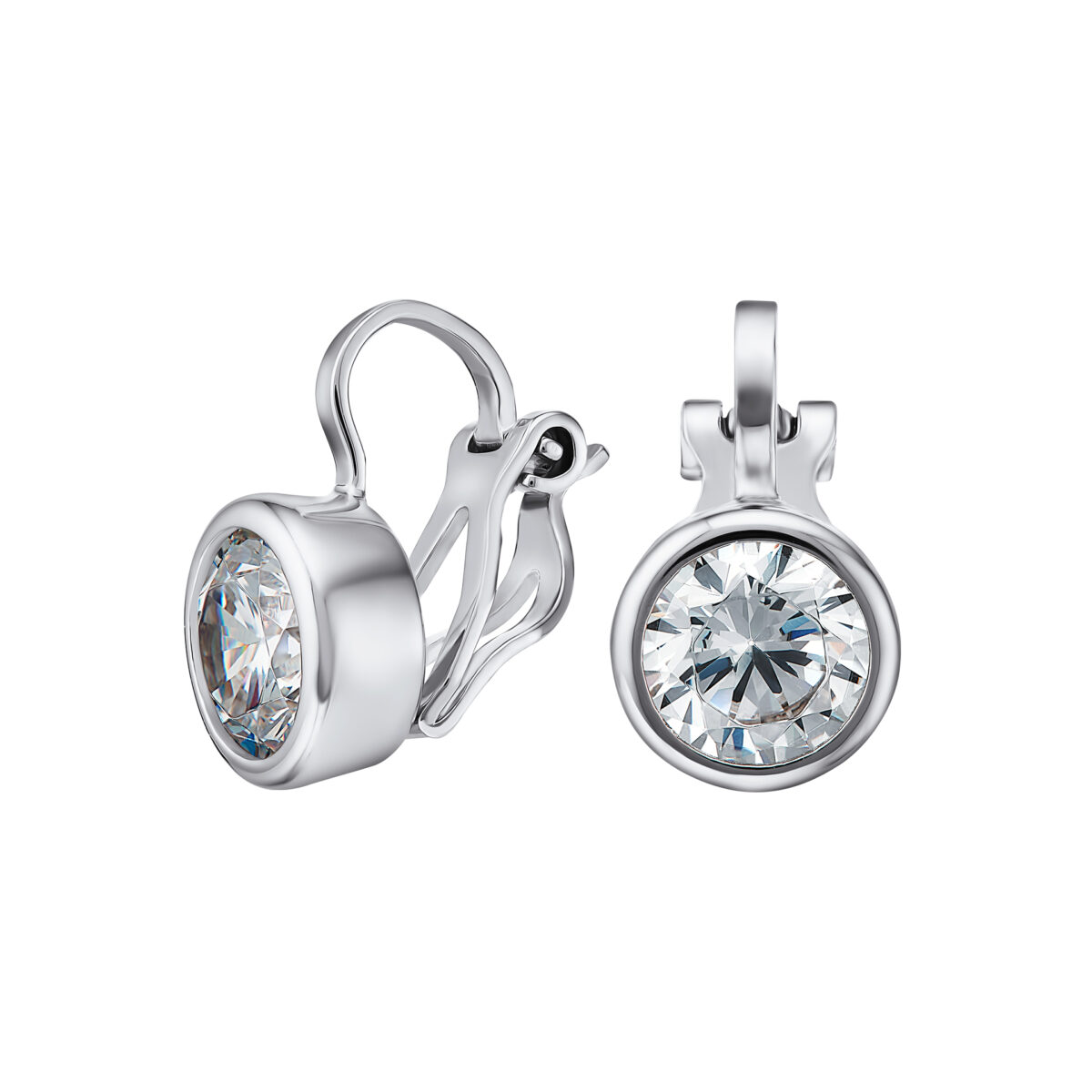 Клипсы с круглыми фианитами глухой закрепки, оправа из серебра плотно прилегает к камню со всех сторон